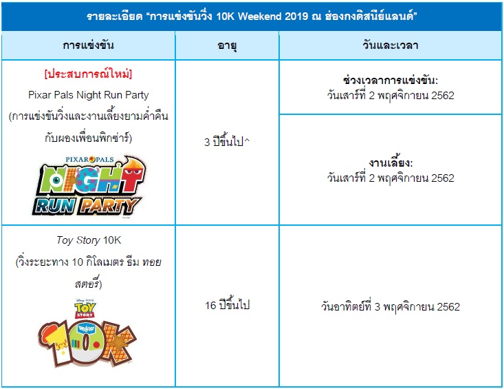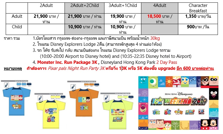 กลับมาอีกครั้ง! การแข่งขันวิ่ง 10K Weekend ประจำปี 2019 ที่ฮ่องกงดิสนีย์แลนด์รีสอร์ท พร้อมการแข่งขันวิ่งดิสนีย์ยามค่าคืนและงานเลี้ยงหลังแข่งครั้งแรก เข้าที่ เตรียมตัว แล้วไปที่ “#HKDisneyland 10K Weekend 2019”! ปีนี้ บรรดาเพื่อนดิสนีย์ และ พิกซ่าร์ กำลังเตรียมปาร์ตี้ดาราดังไปตามเส้นทางวิ่ง การแข่งวิ่งที่น่าตื่นเต้นหลากหลายระยะทาง และกิจกรรมของครอบครัวมากมายให้เลือกสรร ตั้งแต่วันที่ 1 – 3 พ.ย. นี้ รวมประเภทวิ่ง Toy Story 10K, Inside Out 5K, Monsters Inc. 3K และ Pixar Pals Night Run Party อันยอดเยี่ยม ! ด้วยการแข่งวิ่งที่มีทั้งช่วงกลางวัน และ กลางคืน จะทำให้วันหยุดสุดสัปดาห์ของคุณความสนุกกันอย่างเต็มที่กับนักวิ่งทุกวัย ไม่ว่าคุณจะเป็นนักวิ่งป้ายแดงหรือ นักวิ่งมาราธอนตามเทศกาล ส่งท้ายวันด้วยดนตรีสุดมันส์ อาหาร กิจกรรม และ ของที่ระลึกสุดพิเศษเฉพาะงานวิ่ง 10K Weekend ในปีนี้เท่านั้น! สามารถเลือกแพ็คเกจการแข่งขันวิ่งพร้อมการพักผ่อนเต็มรูปแบบในรีสอร์ทได้ที่พันธมิตรการท่องเที่ยว